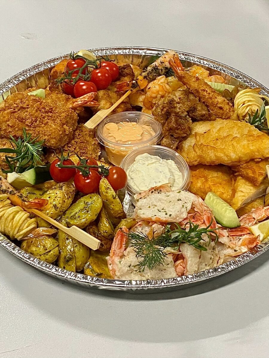 kibbeling, lekkerbek, gepaneerde kabeljauwstukken, inktvis, verschillende soorten scampi (torpedo, butterfly, panko, aardappel), aardappelen met kruiden, tartaar, cocktail, tomaatjes, komkommer